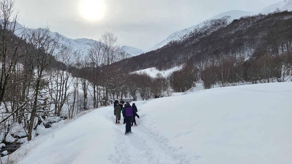 A 14h, nous sommes parti pour une randonnée en raquettes autour du centre dans de magnifiques paysages immaculés et recouverts d'une belle couche de poudreuse qui a rendu notre progression difficile.
