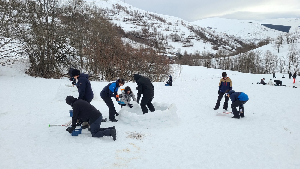 Le second groupe est resté à proximité du centre pour construire des igloos. Des animateurs nous ont montré la technique qui consiste d'abord à découper des blocs de neige et ensuite à les agencer en suivant un cercle et en les décalant à chaque tour.